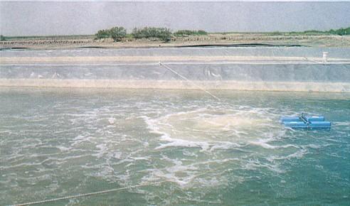 正常工作时,水花大面积扩散到水面,微气泡中的氧在上升过程中继续向液相传递,以实现二次溶解氧的产生,提高曝气效果;同时,水和气体在整个曝气池内形成较大的上下循环,使池底的污泥经常处于翻转悬浮状态,增加了接触面积,消除了曝气池中的死角。