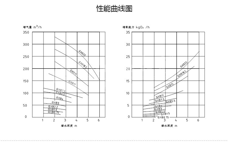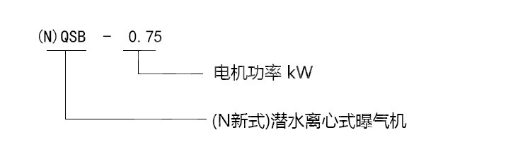 QXB型离心式潜水曝气机为直联式结构。旋转的叶轮在水中产生一个离心力,通过离心力在叶轮周围形成一个负压区,空气通过进气管被吸入,被吸入的空气和水在混合盘内混合,随后这种良好的均匀的混合物自动从排出口四周喷出。