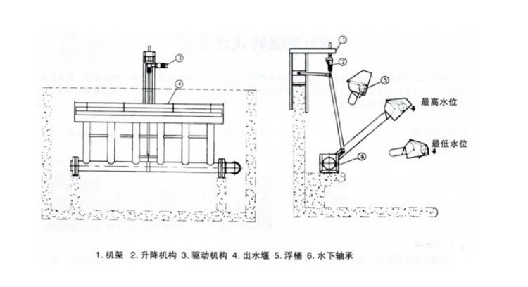 XB滗水器由滗水装置、传动装置、撇渣浮筒装置及回转支承等组成。驱动机构通过可伸缩推杆带动滗水装置及撇渣浮筒装置绕回转支承旋转,从而使滗水堰口上下移动,达到滗出上清液的目的XB-L型旋转式滗水器由集水槽、浮筒、排水管组、回转支座、螺杆、连杆装置、导轨及传动装置组成。XB-D 型旋转式滗水器主要由集水槽、浮筒、排水管组、回转支座、电动推杆及电控箱等组成。XB-F型旋转式滗水器主要由集水槽、浮筒、排水管组、电磁阀、液位计及电控箱等组成。