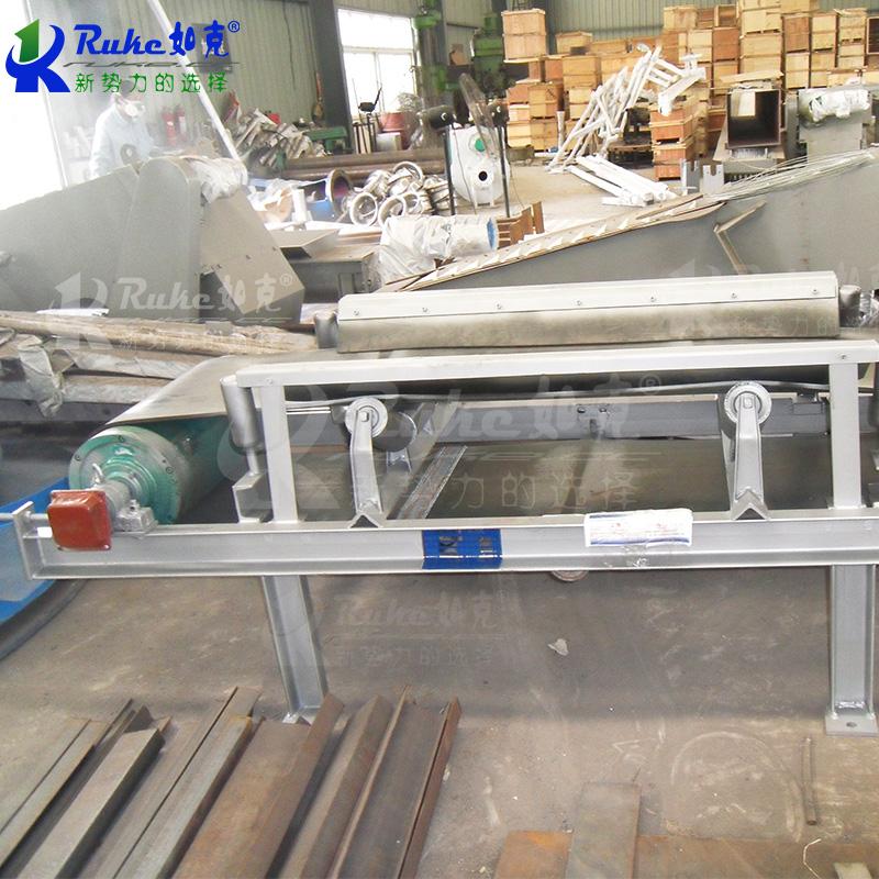 该设备采用连续式槽形带式,物料由格栅或脱水机卸料口落入输送带上,在电动滚筒的驱动下,物料从一端移动到另一端,末端与垃圾桶相衔接,再另行处理。