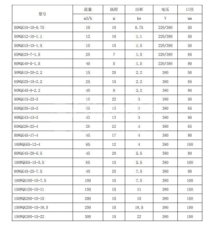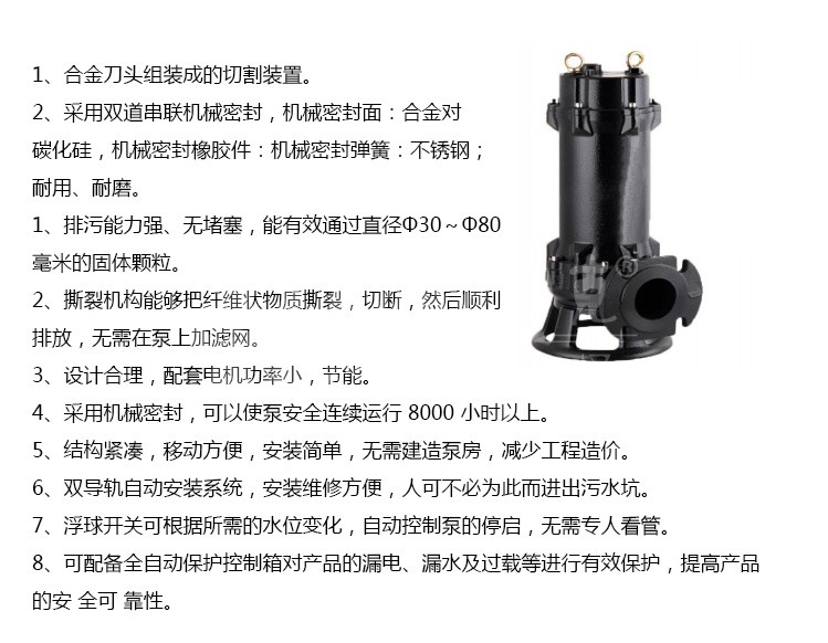 WQG 型切割污水泵整体设计合理,配套电机合理,带有热保护装置,效率高,节能,广泛应用于企业单位、工厂、住宅区的污水排水站,也可用于化粪池、沼气池的污水排放。WQG 型切割污水泵结构紧凑,体积小,移动方便,安装简便,无需建泵房,潜入水中即可工作,大大减小工程造价。另外可根据客户实际使用情况,配置全自动安全保护控制柜和浮球开关,自动控制 WQG 型切割污水泵的启停,保证了泵运行可靠。